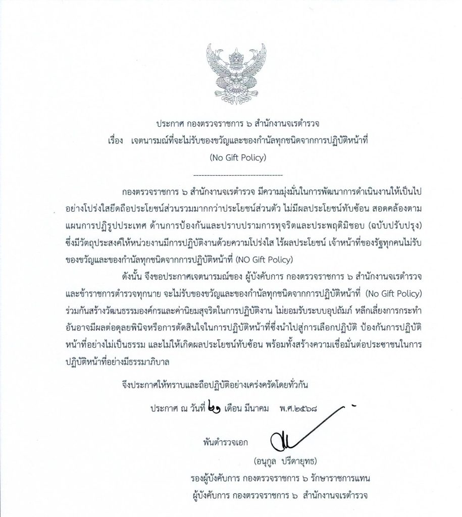 เจตนารมณ์ที่จะไม่รับของขวัญและของกำนัลทุกชนิดจากการปฏิบัติหน้าที่ (No Gift Policy)